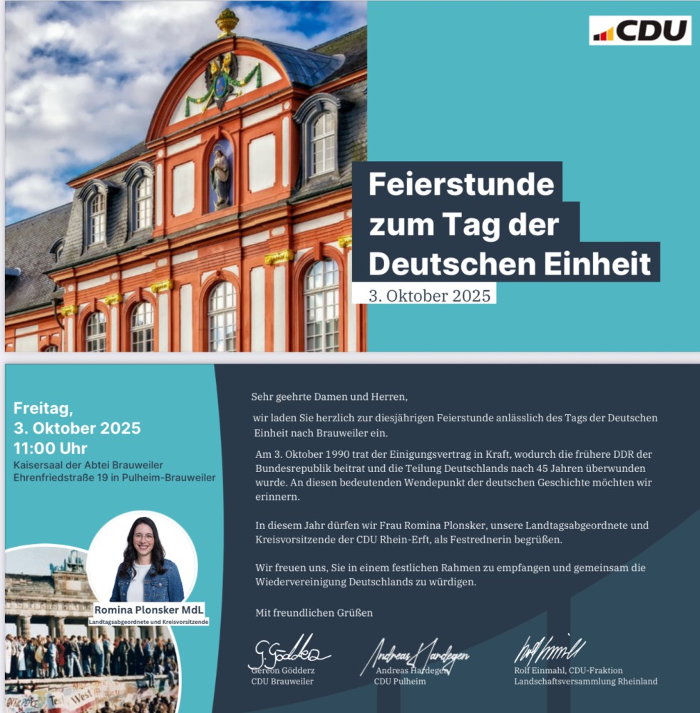 Die CDU Pulheim lädt alle Bürgerinnen und Bürger herzlich ein, am Freitag, den 3. Oktober 2025, um 11:00 Uhr im Kaisersaal der Abtei Brauweiler gemeinsam der Wiedervereinigung Deutschlands zu gedenken.