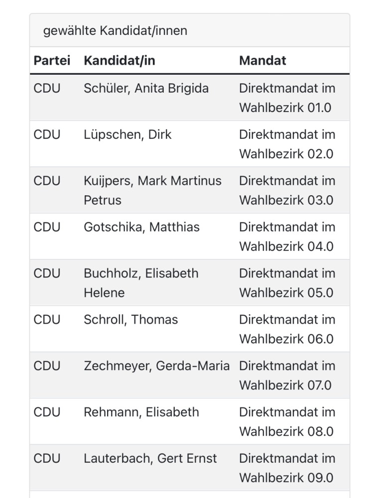 Alle unsere Kandidatinnen und Kandidaten konnten ihre Wahlkreise gewinnen – ein tolles Ergebnis und ein starkes Zeichen des Vertrauens. Das Foto aus dem Wahlkampf zeigt also auch die neue CDU-Fraktion, die am Montag offiziell gebildet wurde. In den weiteren Fotos findet Ihr die Namen der Mitglieder und den Wahlkreis. Detaillierte Ergebnisse findet Ihr unter dem Link - Wahlen.Votemanager.de.